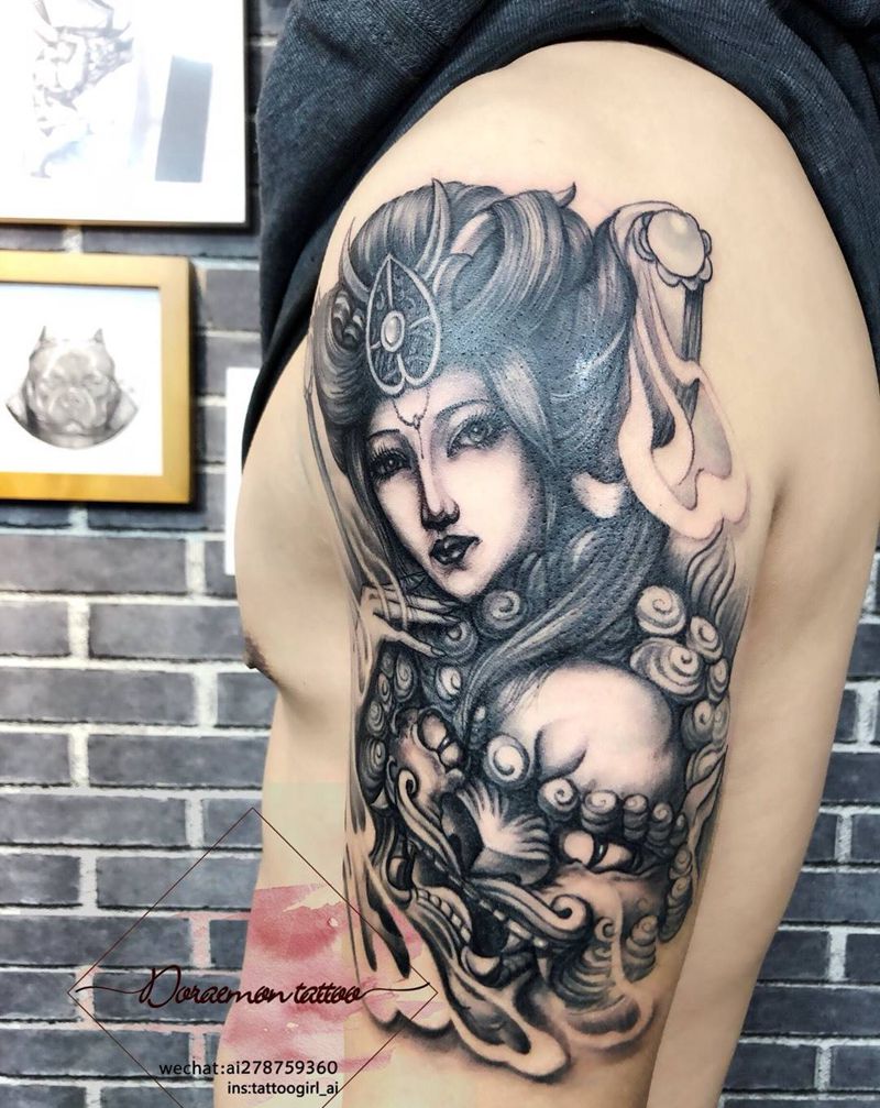 当前位置: 首页 >上海市纹身店-哆啦刺青纹身图案>改图,艺妓纹身图片_成品手臂写实肖像清新传统人物纹身图案