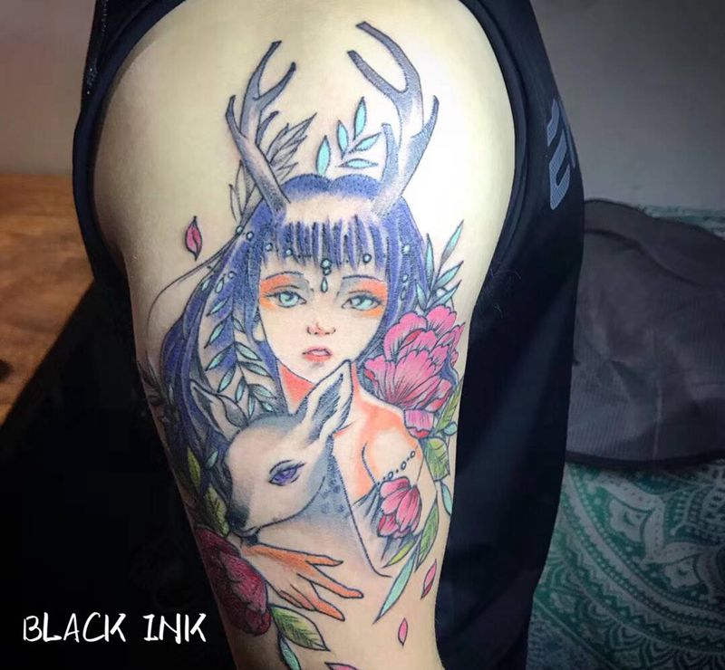当前位置: 首页 >上海市纹身店-BLACK INK 纹身图案>少女与鹿纹身图片_手臂New School纹身图案