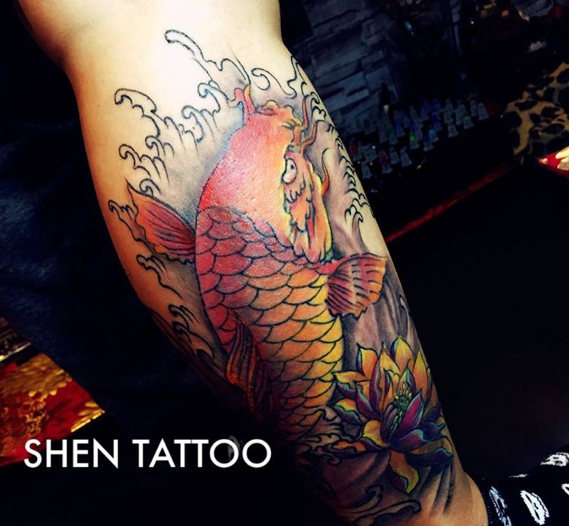 当前位置: 首页 >上海市纹身店-BLACK INK 纹身图案>鲤鱼 完成纹身图片_成品腿部传统动物纹身图案