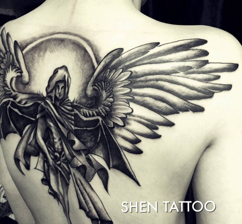 欧美黑灰纹身图片_成品背部欧美宗教纹身图案