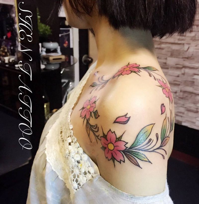 当前位置: 首页 >上海市纹身店-BLACK INK 纹身图案>花与女孩纹身图片_成品肩部欧美清新植物纹身图案