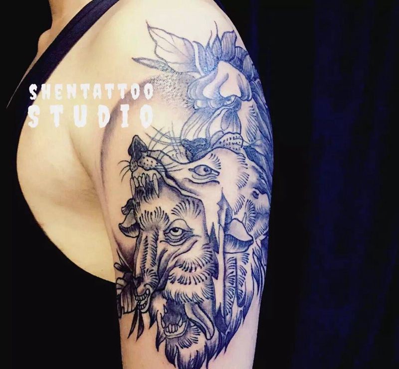 狮羊狼结合体纹身图片_成品手臂欧美原创动物纹身图案