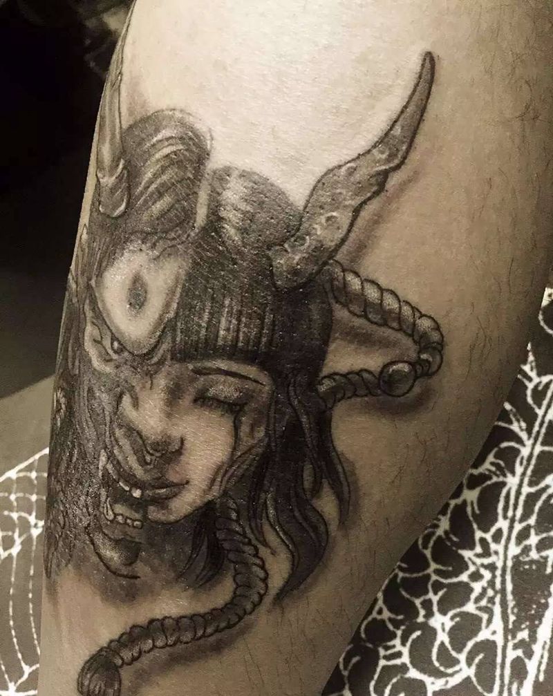 般若纹身图片_成品腿部传统鬼神纹身图案