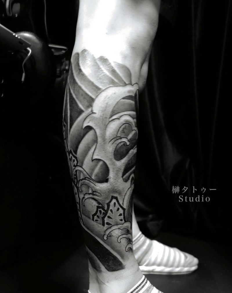 传统 山石 浪 完成纹身图片_成品腿部传统原创纹身图案
