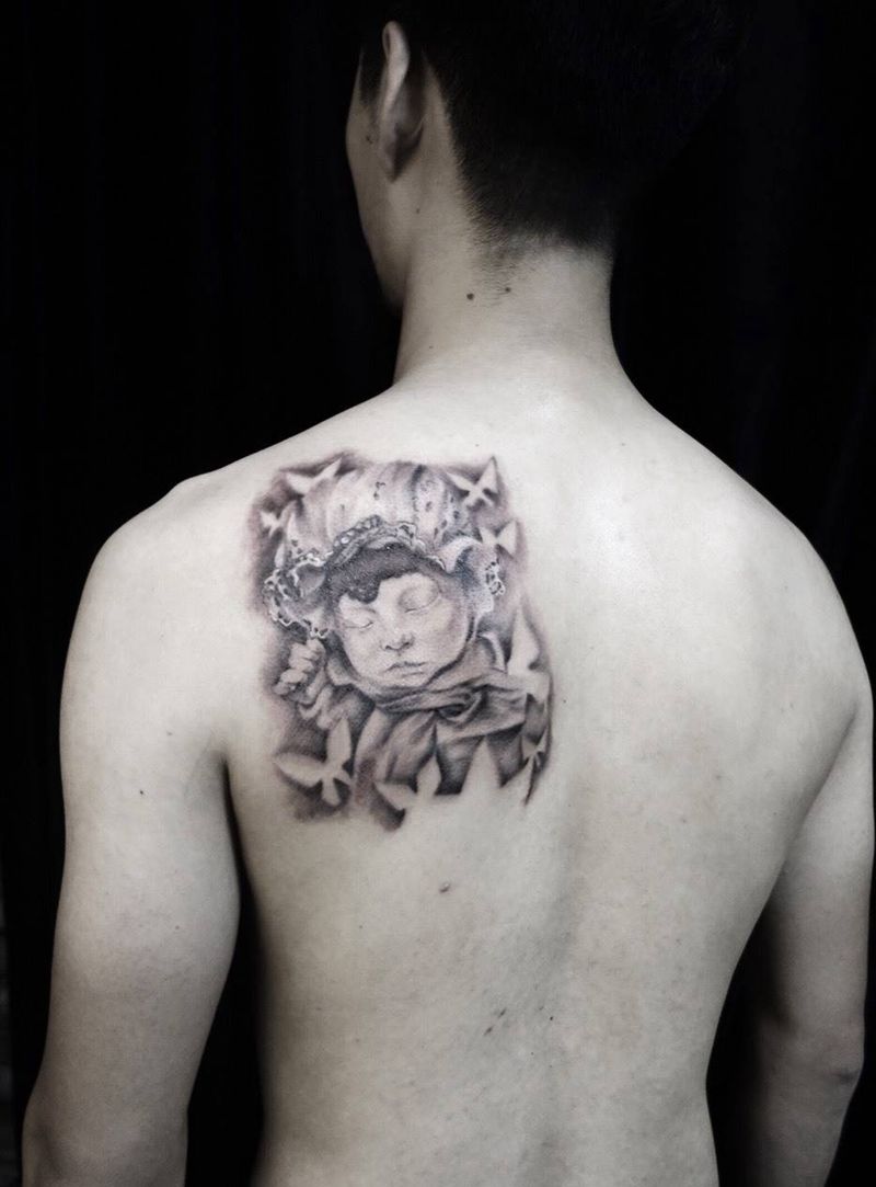婴儿肖像纹身图片_成品背部欧美写实肖像原创人物纹身图案