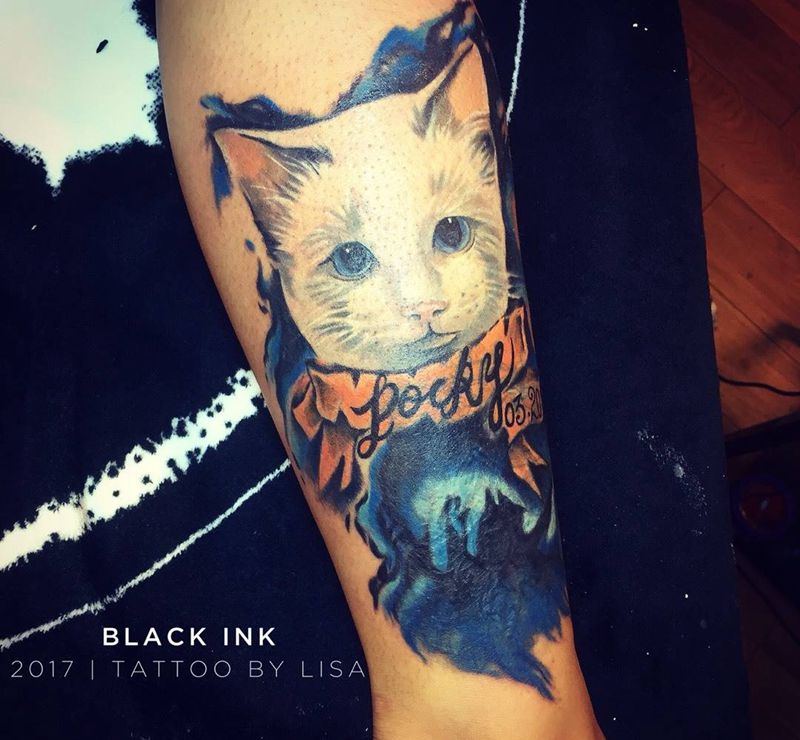 当前位置: 首页 >上海市纹身店-BLACK INK 纹身图案>写实猫咪遮盖纹身图片_成品腿部欧美写实动物原创纹身图案