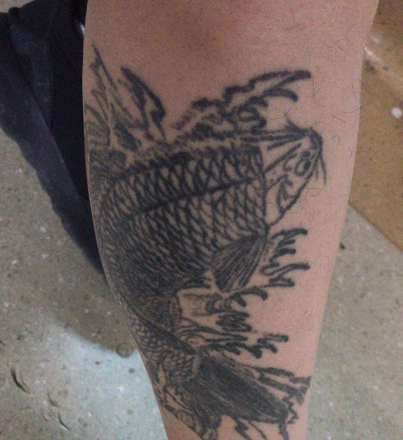 当前位置: 首页 >上海市纹身店-BLACK INK 纹身图案>小腿鲤鱼遮盖第一次纹身图片_成品腿部传统动物图腾原创纹身图案