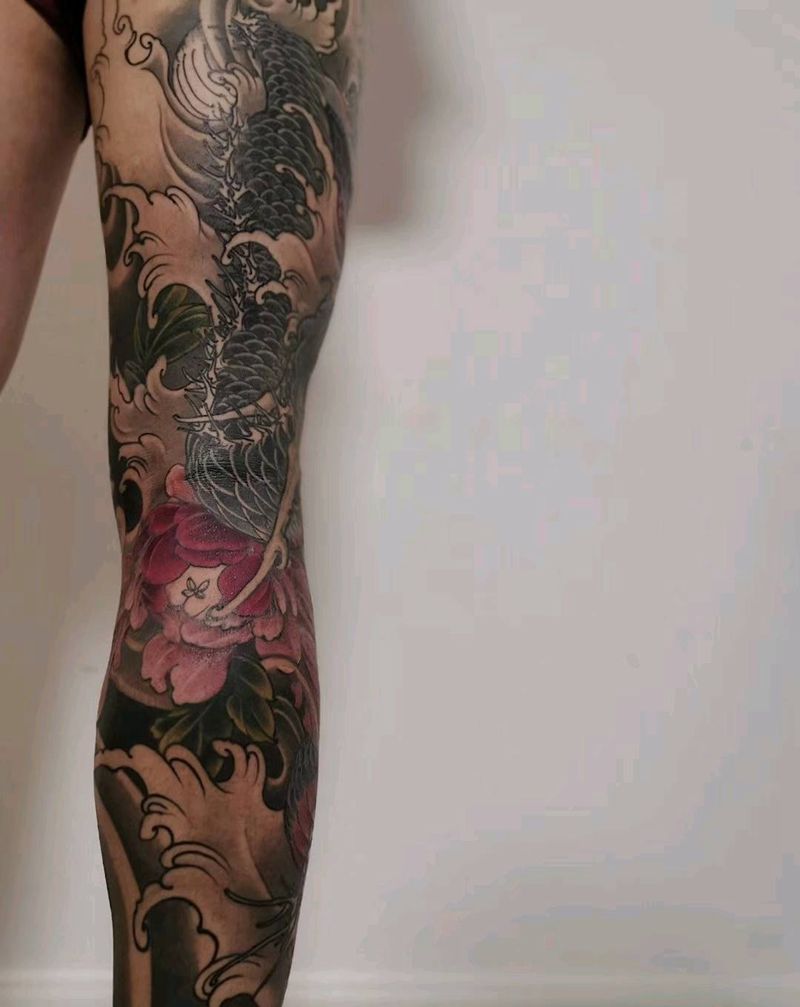 • T网红王老大花腿龙纹身图片_腿部新传统纹身图案