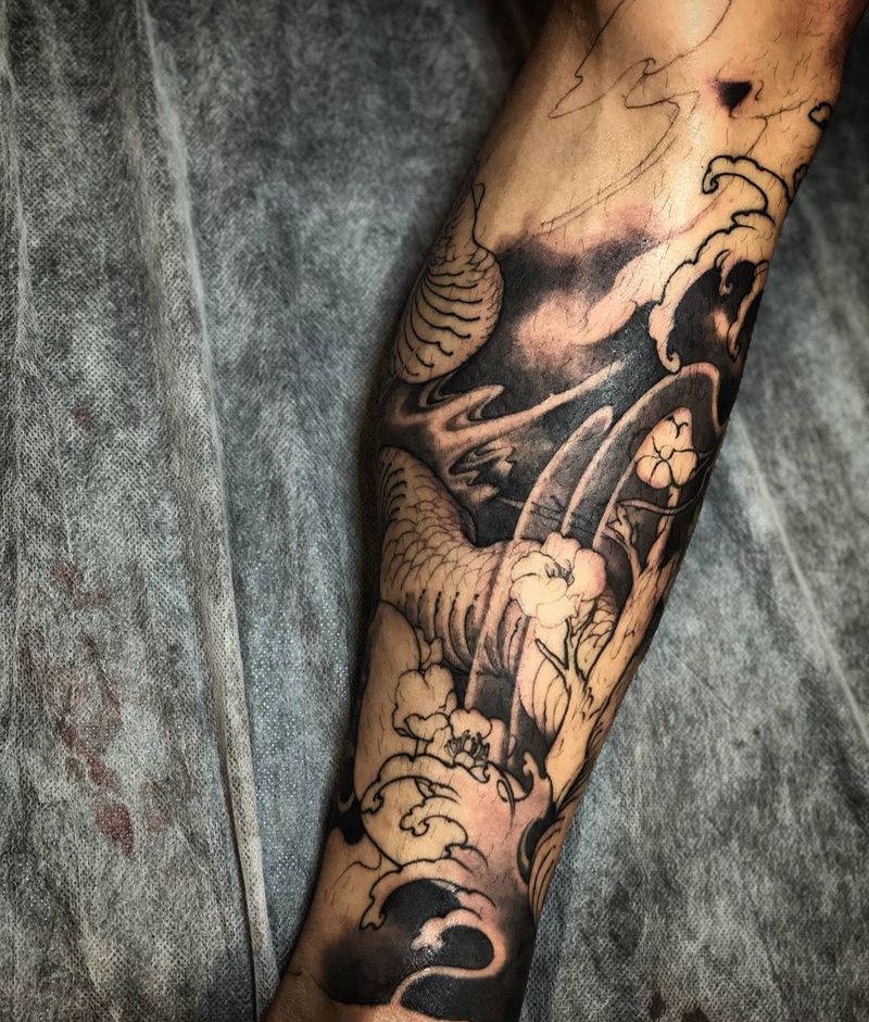 • T网红王老大花腿龙纹身图片_腿部新传统纹身图案