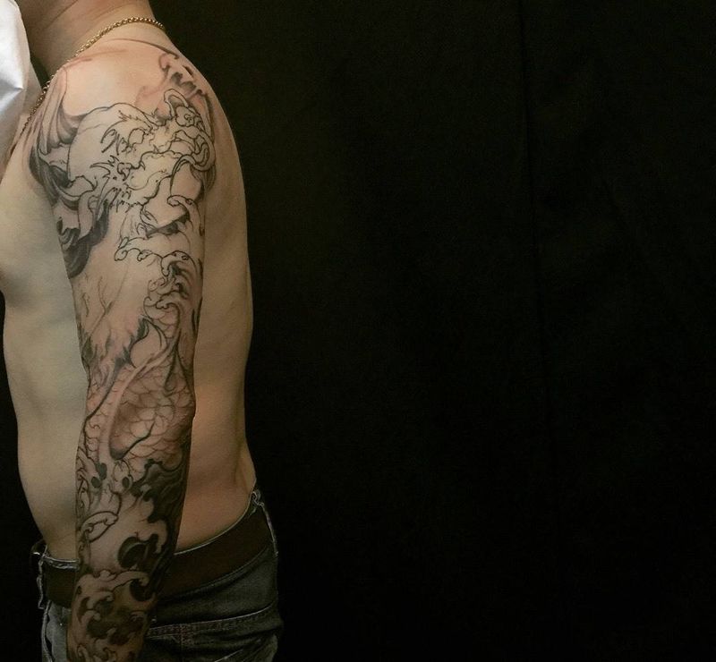 • T网红王老大花腿龙纹身图片_腿部新传统纹身图案