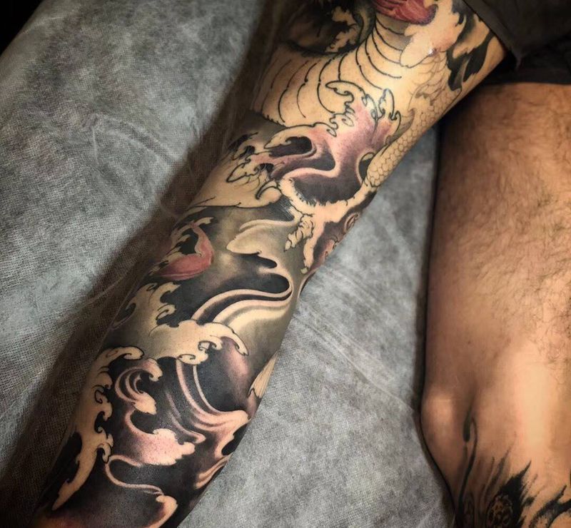 • T网红王老大花腿龙纹身图片_腿部新传统纹身图案