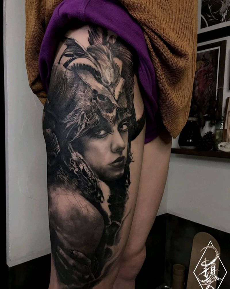 大腿肖像纹身图片_腿部欧美写实纹身图案