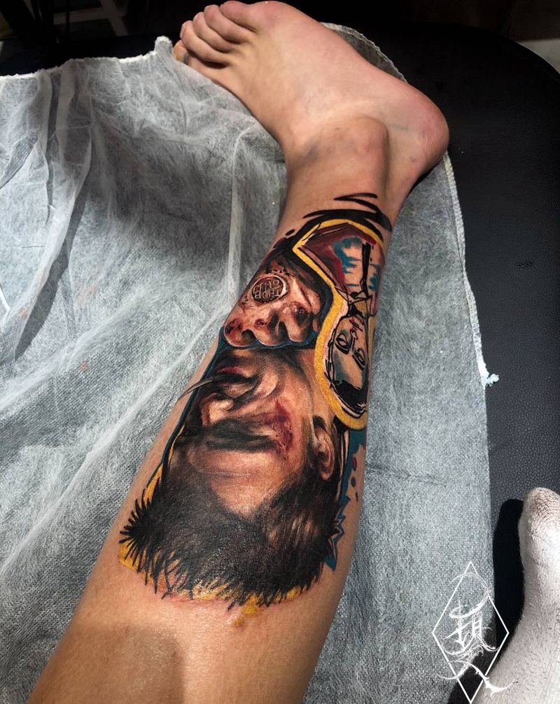 当前位置: 首页 >上海市纹身店-顷久Tattoo纹身图案>彩色人物纹身图片_腿部手臂欧美写实肖像纹身图案