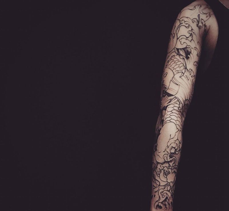 当前位置: 首页 >上海市纹身店-顷久Tattoo纹身图案>花臂鱼线条黑灰第一次纹身图片_成品手臂手部传统动物鬼神人物原创纹身图案