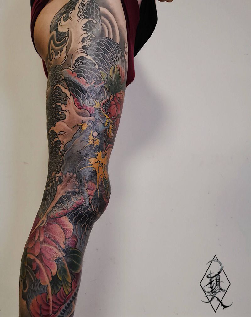 • T网红王老大花腿龙纹身图片_腿部新传统纹身图案
