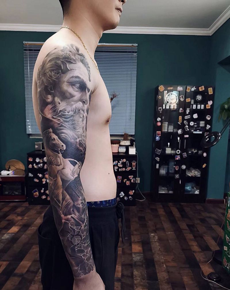 当前位置: 首页 >上海市纹身店-顷久Tattoo纹身图案>欧美黑灰纹身图片_手臂腿部欧美写实新传统写实神话人物狮子纹身图案