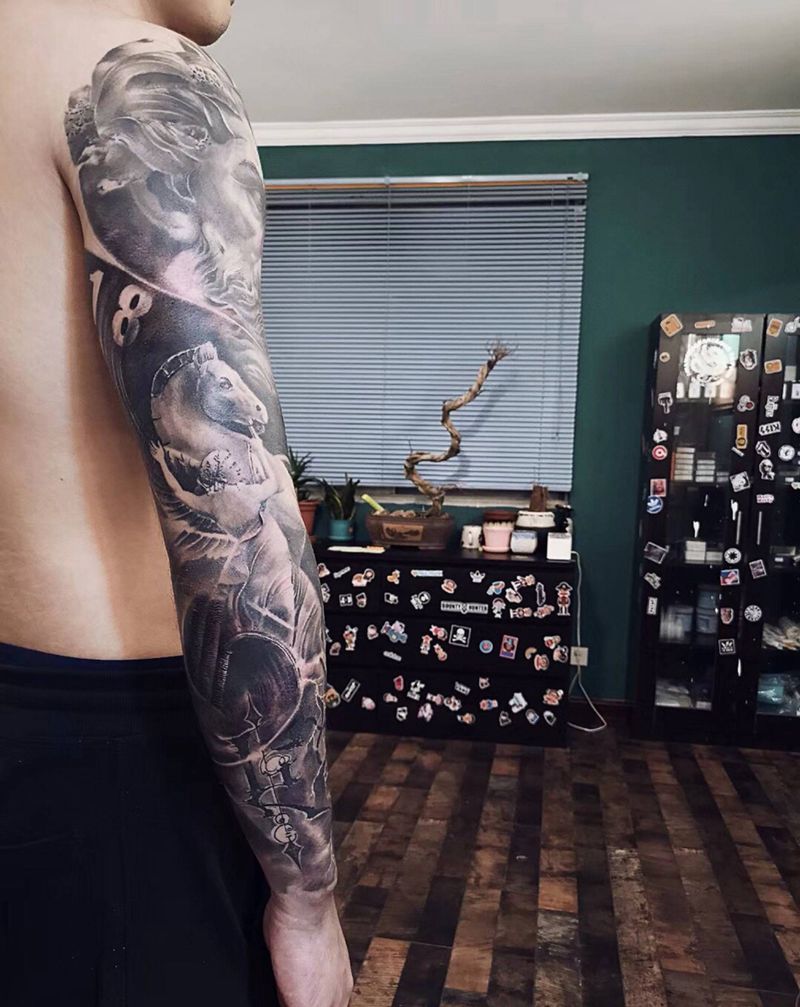 当前位置: 首页 >上海市纹身店-顷久Tattoo纹身图案>欧美黑灰纹身图片_手臂腿部欧美写实新传统写实神话人物狮子纹身图案
