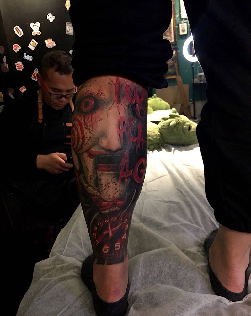 当前位置: 首页 >上海市纹身店-顷久Tattoo纹身图案>彩色写实 电锯惊魂纹身图片_手臂腿部欧美写实纹身图案