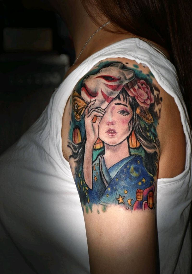 覆盖作品:艺妓纹身图片_肩部手臂水彩New School艺妓覆盖纹身图案