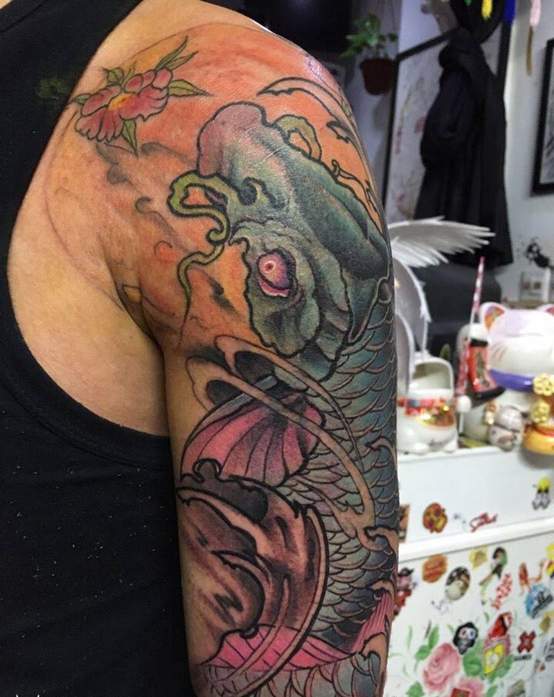 • T网红王老大花腿龙纹身图片_腿部新传统纹身图案