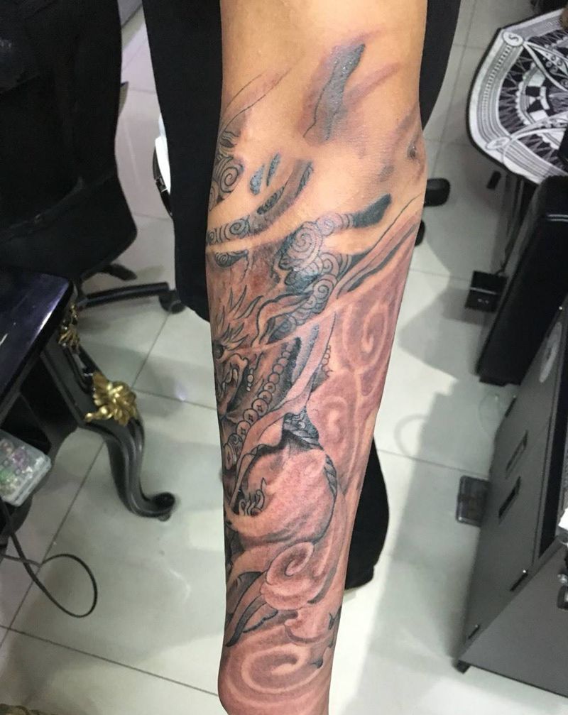 • T网红王老大花腿龙纹身图片_腿部新传统纹身图案