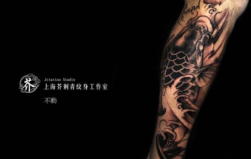 黑鲤纹身图片_手稿成品宗教原创国画习俗传统动物脚部腿部纹身图案
