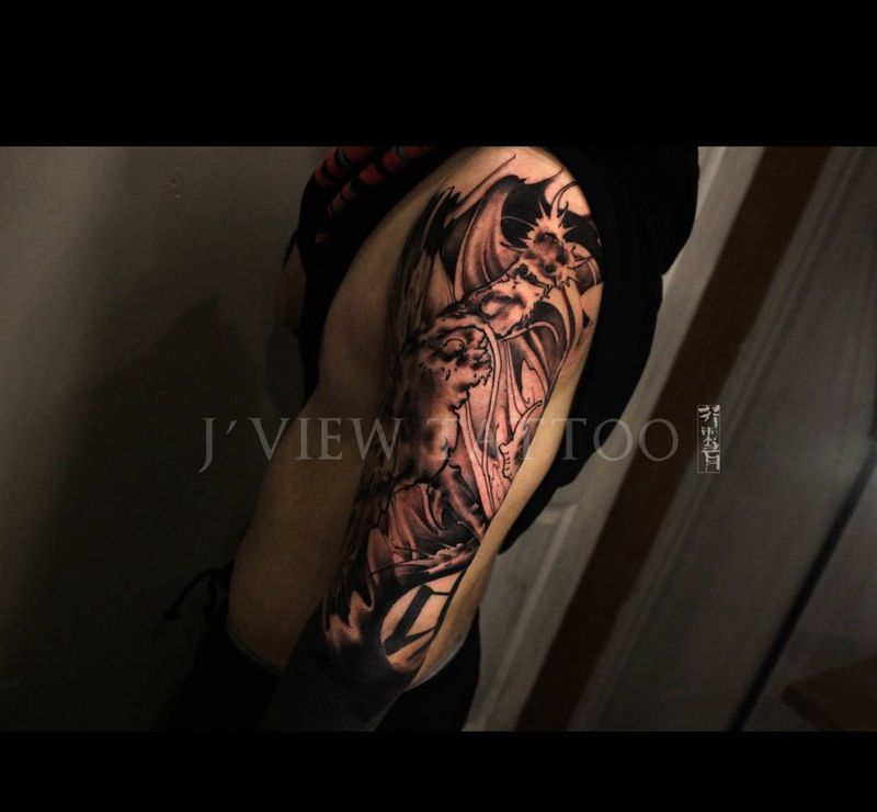 • T网红王老大花腿龙纹身图片_腿部新传统纹身图案