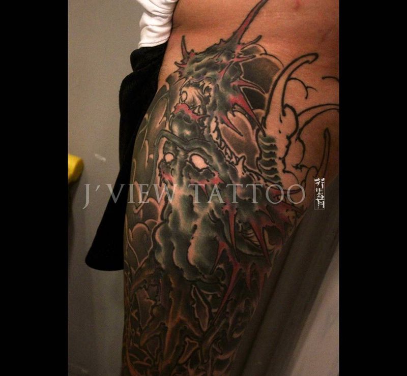 • T网红王老大花腿龙纹身图片_腿部新传统纹身图案