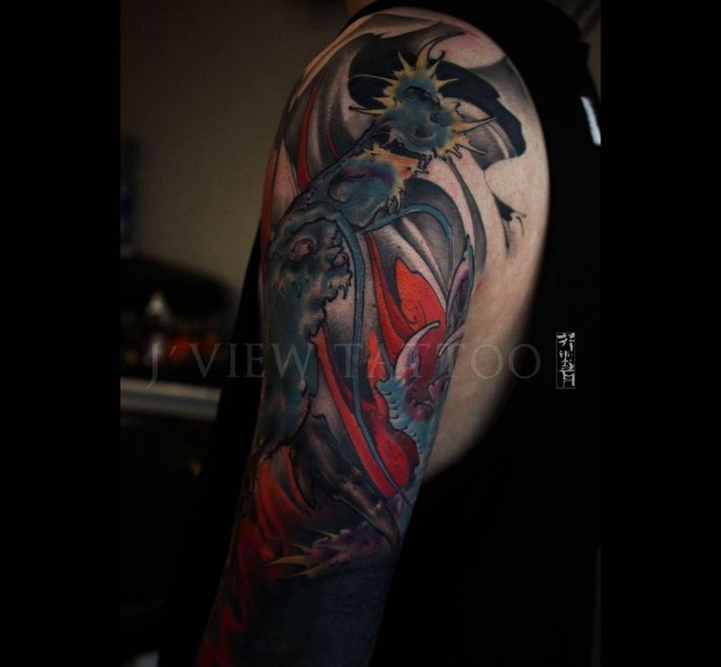 • T网红王老大花腿龙纹身图片_腿部新传统纹身图案