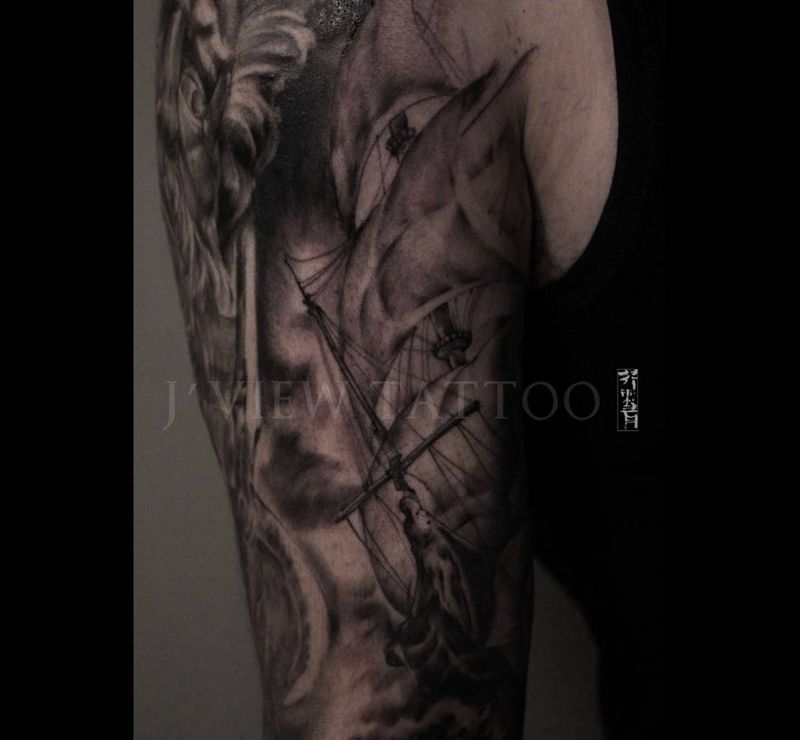 当前位置: 首页 >上海市纹身店-须弥山XUMISHAN TATTOO SHOP (原芥刺青)纹身图案>大臂部分收尾纹身图片_手稿成品手臂肖像欧美写实原创鬼神宗教人物纹身图案