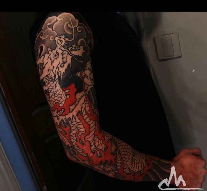 • T网红王老大花腿龙纹身图片_腿部新传统纹身图案