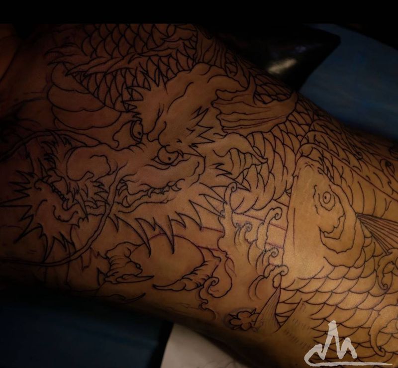 • T网红王老大花腿龙纹身图片_腿部新传统纹身图案