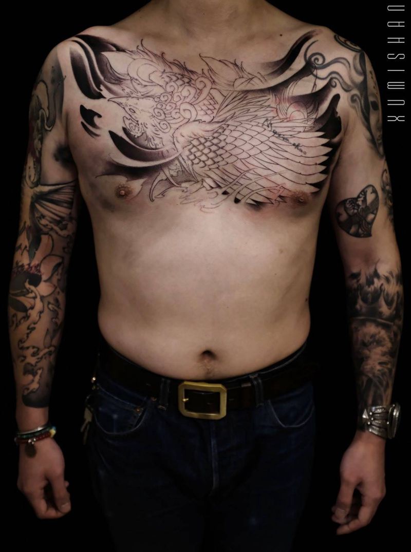 当前位置: 首页 >上海市纹身店-须弥山XUMISHAN TATTOO SHOP (原芥刺青)纹身图案>胸花_凤凰纹身图片_肩部胸部新传统老传统纹身图案
