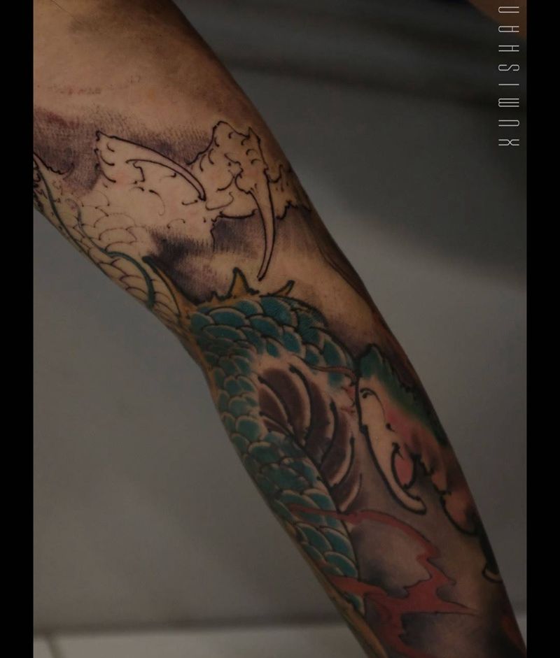 • T网红王老大花腿龙纹身图片_腿部新传统纹身图案