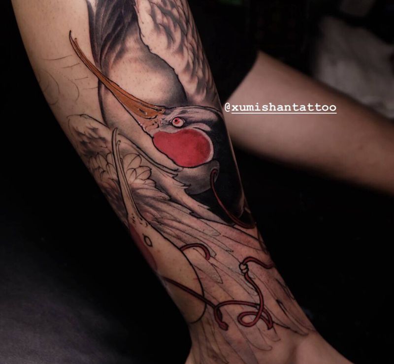 双鹤 进度纹身图片_腿部新传统鹤纹身图案