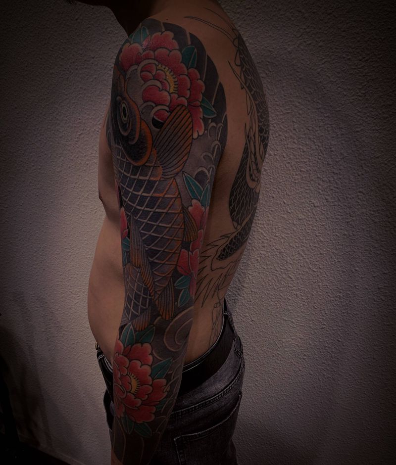 当前位置: 首页 >上海市纹身店-康亚刺青纹身图案>鲤鱼牡丹花臂纹身图片_手臂手部老传统水彩纹身图案