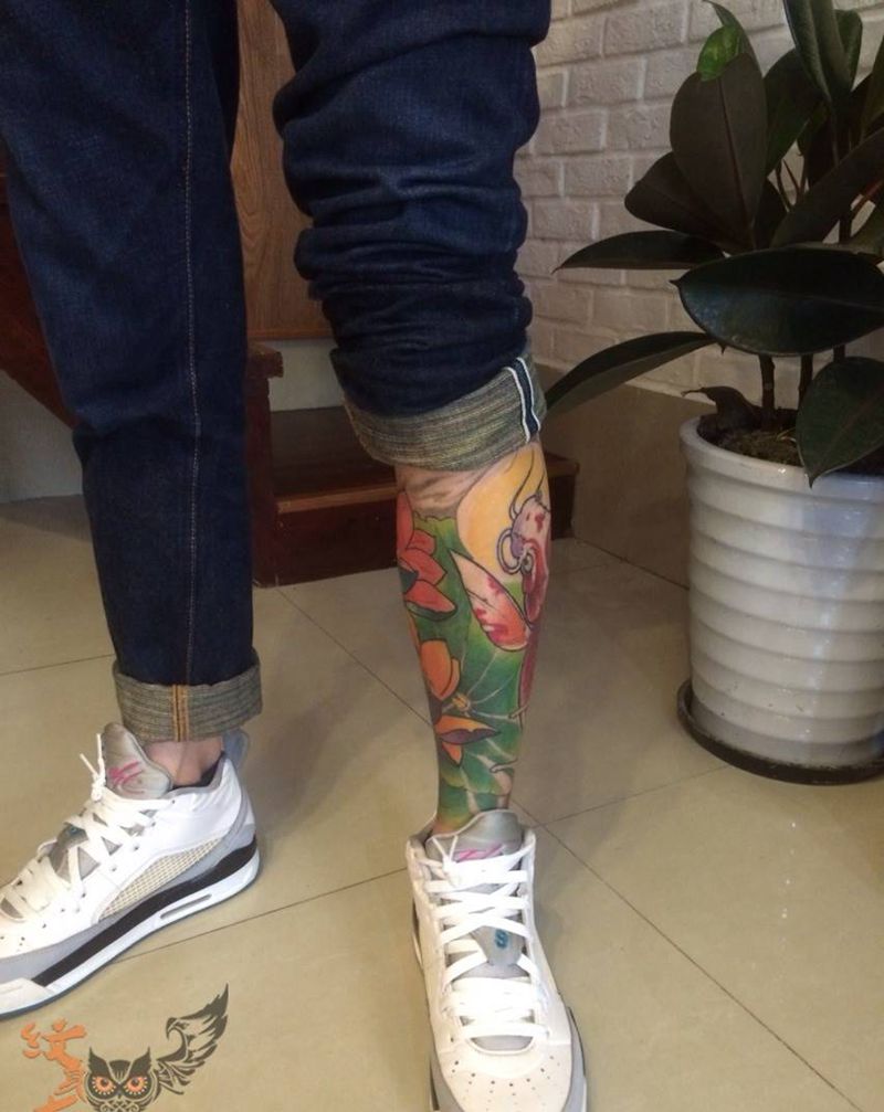 • T包小腿吹火男+阿多福纹身图片_腿部老传统新传统吹火男阿
