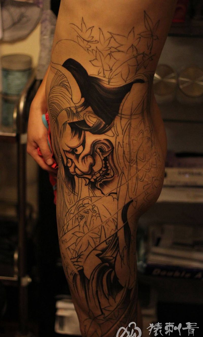 传统彩色般若纹身图片_腿部腰部腹部臀部传统人物植物纹身图案