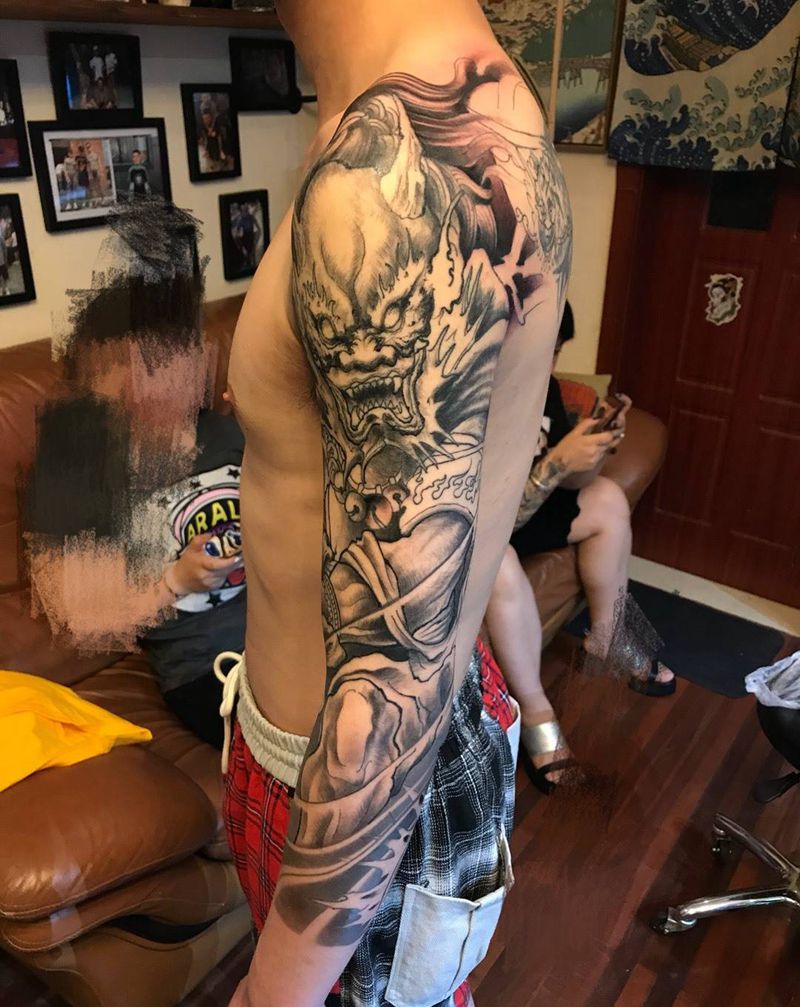 雷神花臂纹身图片_成品手部手臂传统写实鬼神纹身图案