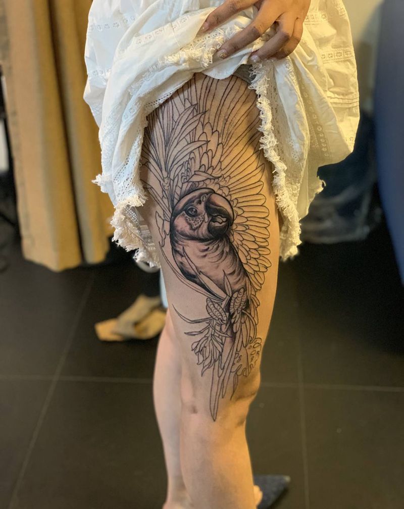 当前位置: 首页 >上海市纹身店-猿刺青纹身图案>newschool 鹦鹉纹身图片_腿部New School纹身图案