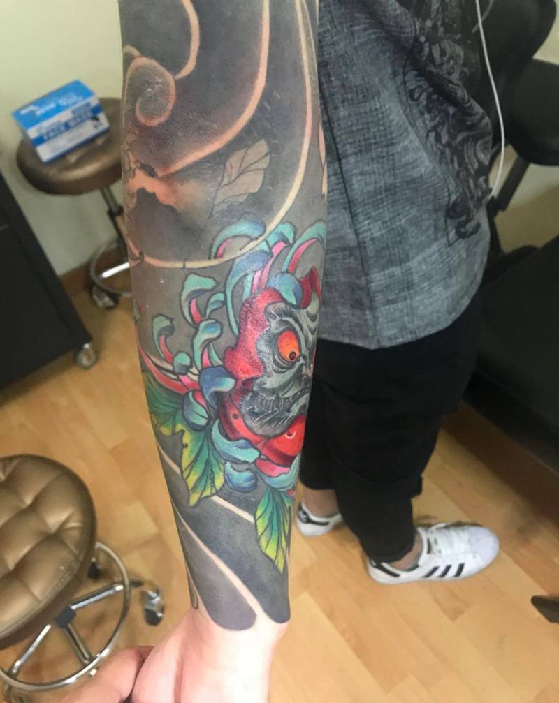 当前位置: 首页 >上海市纹身店-影刺青纹身图案>彩色包小臂!未完成纹身图片_插画传统鬼神宗教图腾动物纹身图案