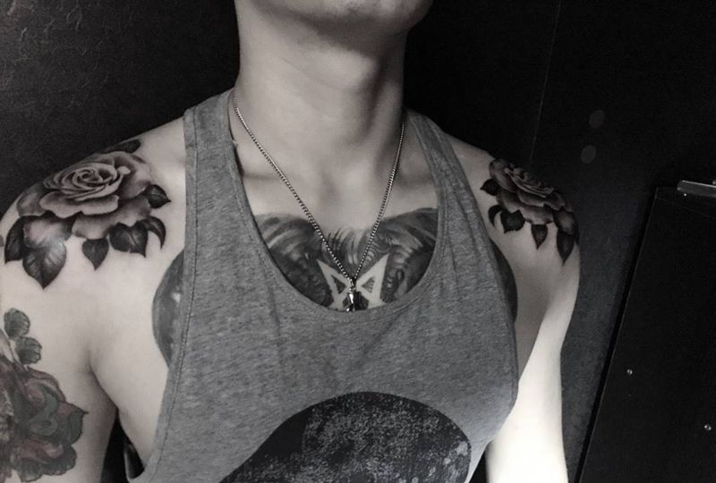 当前位置: 首页 >上海市纹身店-霸龙堂刺青纹身图案>双肩写实黑灰玫瑰纹身图片_成品肩部写实欧美植物纹身图案