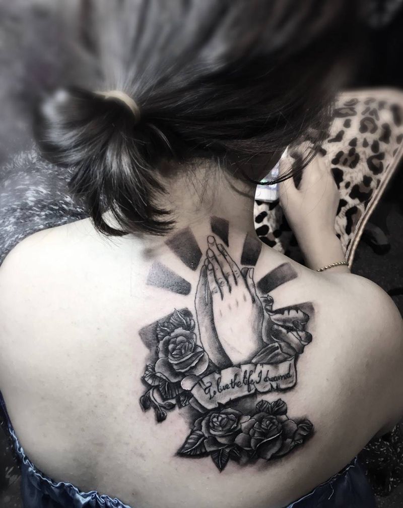 祈祷之手纹身图片_成品肩部背部写实欧美人物植物纹身图案