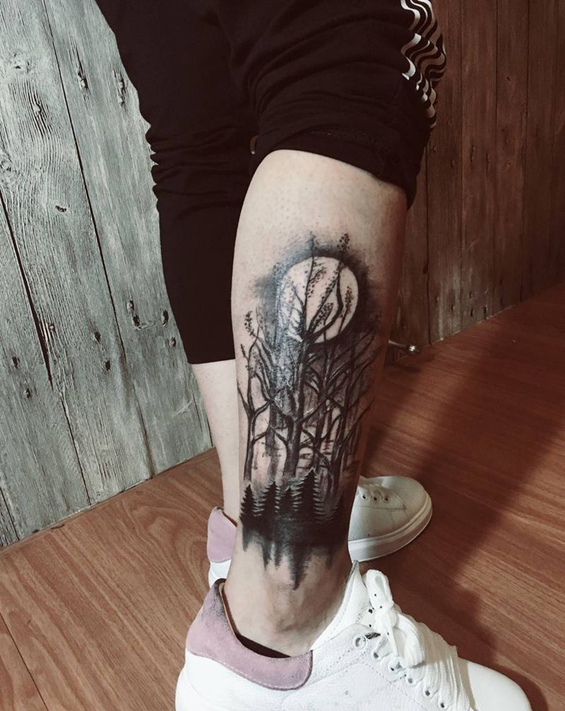 当前位置: 首页 >上海市纹身店-霸龙堂刺青纹身图案>手绘森林覆盖纹身图片_成品腿部写实欧美植物纹身图案
