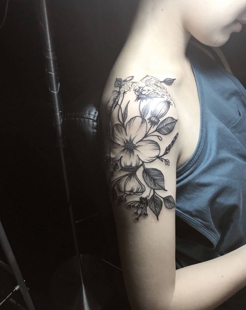 简约花纹身图片_成品肩部清新静物植物纹身图案