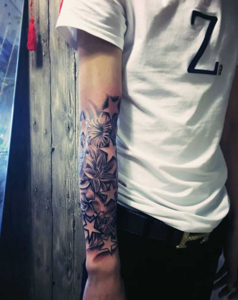 五星花臂纹身图片_成品手臂欧美植物纹身图案