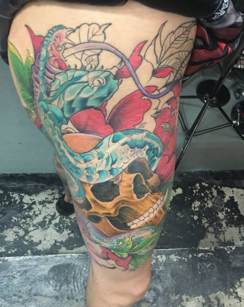 当前位置: 首页 >上海市纹身店-上海任刺青纹身工作室纹身图案>骷髅蛇与花纹身图片_成品腿部臀部欧美写实动物植物人物鬼神腰部纹身图案