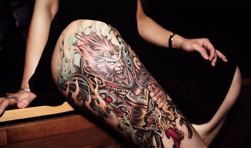 当前位置: 首页 >上海市纹身店-上海任刺青纹身工作室纹身图案>齐天大圣纹身图片_传统国画腿部臀部成品人物鬼神动物肖像腰部纹身图案