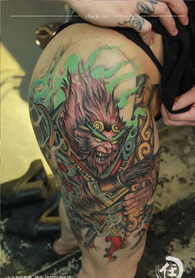 当前位置: 首页 >上海市纹身店-上海任刺青纹身工作室纹身图案>齐天大圣纹身图片_传统国画腿部臀部成品人物鬼神动物肖像腰部纹身图案