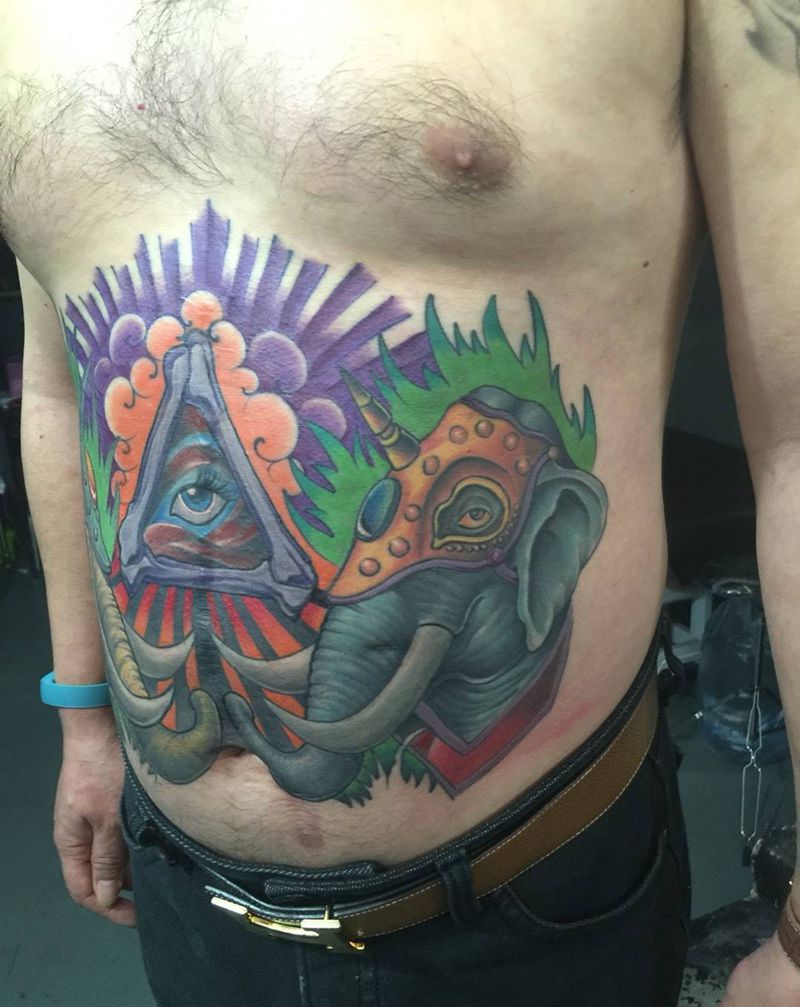 当前位置: 首页 >上海市纹身店-上海任刺青纹身工作室纹身图案>象神守护上帝之眼纹身图片_成品腹部腰部欧美传统鬼神动物原创写实图腾纹身图案